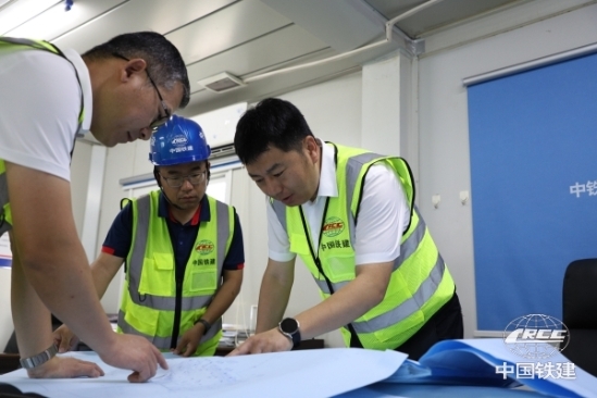 于占福(右一)和管理人員討論施工部署(周雨虹 攝)