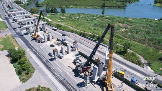 在全線重難點(diǎn)工程龍王江橋施工中,項(xiàng)目團(tuán)隊(duì)打出了一套科技“組合拳”,通過跨地鐵疊合梁滿堂支架法施工、低凈空大噸位起重機(jī)提梁拼裝以及三幅并行曲線橋原位支架法拼裝等工藝的結(jié)合,猶如精密的外科手術(shù)一般——將11跨,總用鋼量約5000噸,最大跨度55米的鋼混疊合梁安裝誤差控制在2毫米內(nèi),施工期間還保障了河道、地面的正常通行安全。